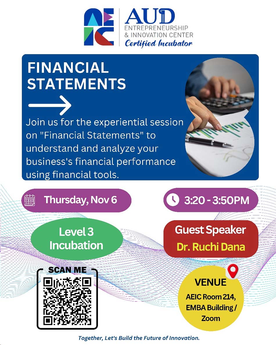 Join us for an experiential session on “Financial Statements” and learn how to analyze your business’s financial performance. Gain hands-on insights that you can immediately apply to your startup or venture.