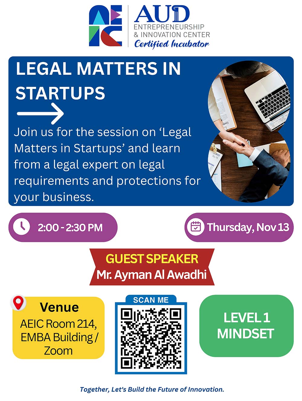 Join us for the session on “Legal Matters in Startups” and learn from a legal expert on legal requirements and protections for your business.